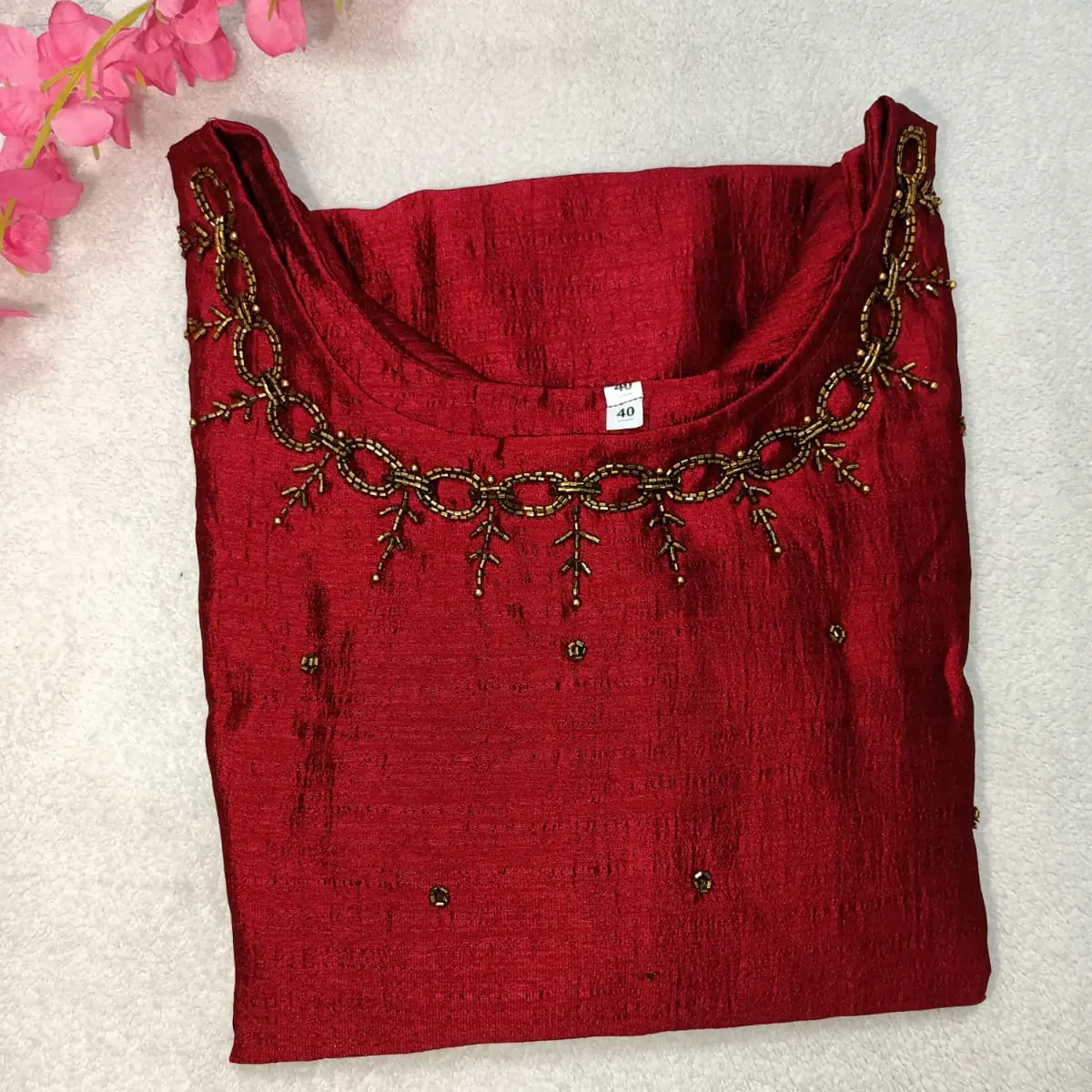Material silk fabric sideslit with aariwork in the neck portion till the chest 3/4th hands soft silk colour is cherry red ideal for partywear,officewear, casual wear, designer wear, unquie handwork Kurtis collection