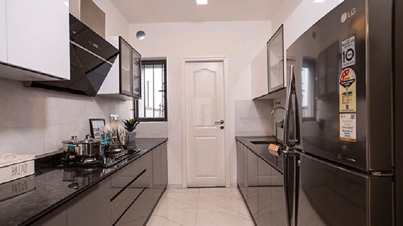 Kitchen : Platform will be finished with granite slab of 600mm wide at height of 800mm from the finished floor level