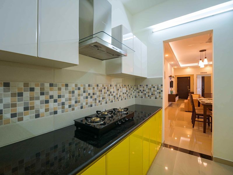 Cooking platform top will be of Polished black granite with half round nosing // Single bowl stainless steel sink with drain board // Kitchen will be provided with 2 Nos. of sink cock and aquaguard provision. // Kitchen will not be provided with a door.